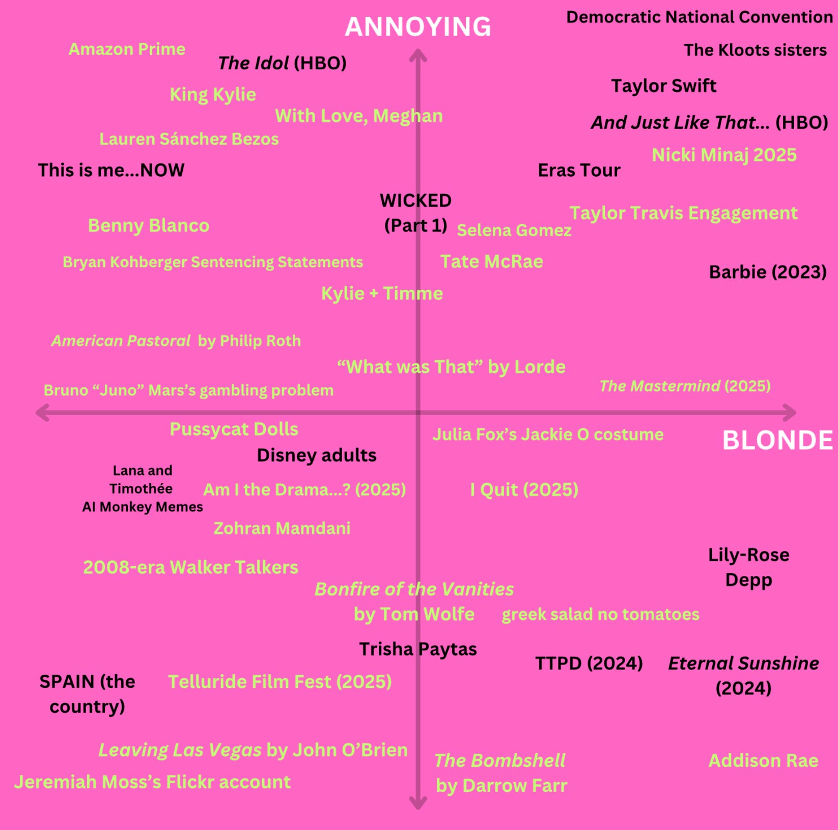 With ANNOYING BLONDES I hope to connect with other skeptical readers who find themselves following a trend, news story, or public personality off a cliff because it drives them to exhilaration, terror, envy, euphoria, or braindead bliss. Reach out if there’s a specific pop cultural phenomena you’d like me to explore— I take requests!