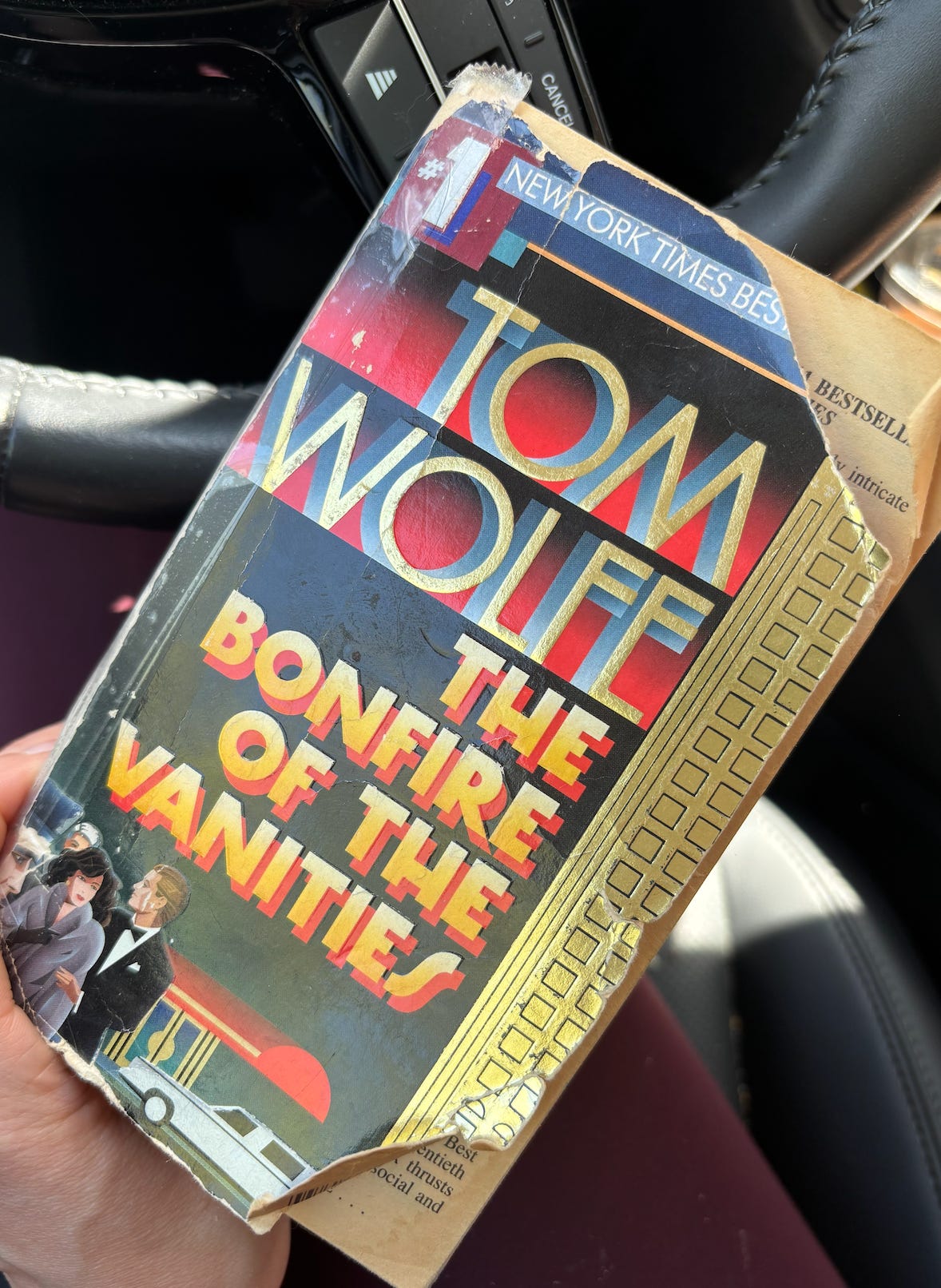 And thank God I’m on an 80s reading kick, because they loved telephones back then. I finally read Nora Ephron’s Heartburn and now I’m nearly done with Tom Wolfe’s wild and crazy satire BONFIRE OF THE VANITIES, which kicks off with an important telephone scene. Before I get to it, here is a gratuitous photo of my Little Free Library-acquired paperback copy of the novel, which disintegrates in my hands anytime I read it, amplifying the reading experience by reminding me that 1984 was quite a long time ago.