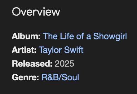 I find the album’s self-awareness emotionally draining. Each song feels engineered to satisfy a particular type of fan. She’s no longer Taylor Swift without the world’s attention on her, and this album feels written not as personal catharsis but as explicit product. That’s what’s so draining about it: there’s zero intimacy.
